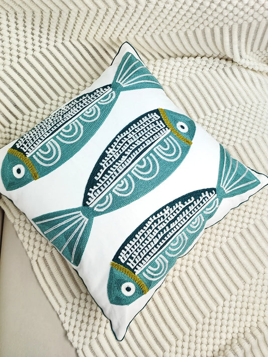 Ocean Thread: Blue Fish Embroidered Cushion Cover