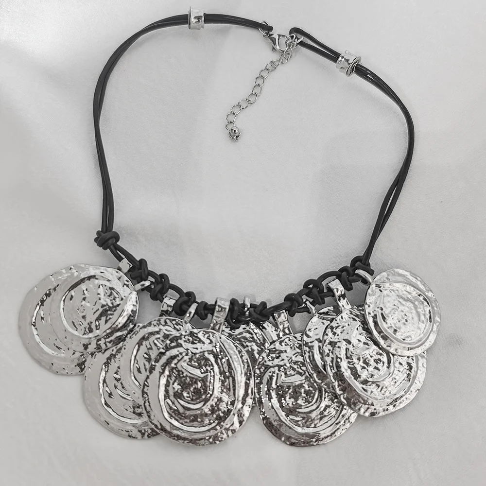 Dale un toque rústico a tu colección de accesorios con este collar con medallón de inspiración vintage , con un cordón doble de cuero con detalles de nudos y un llamativo colgante redondo de metal . Es una pieza atemporal que combina a la perfección con looks bohemios, casuales o para festivales.