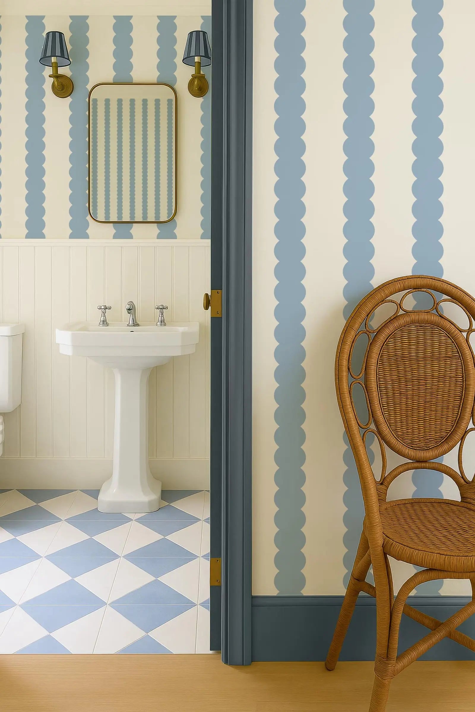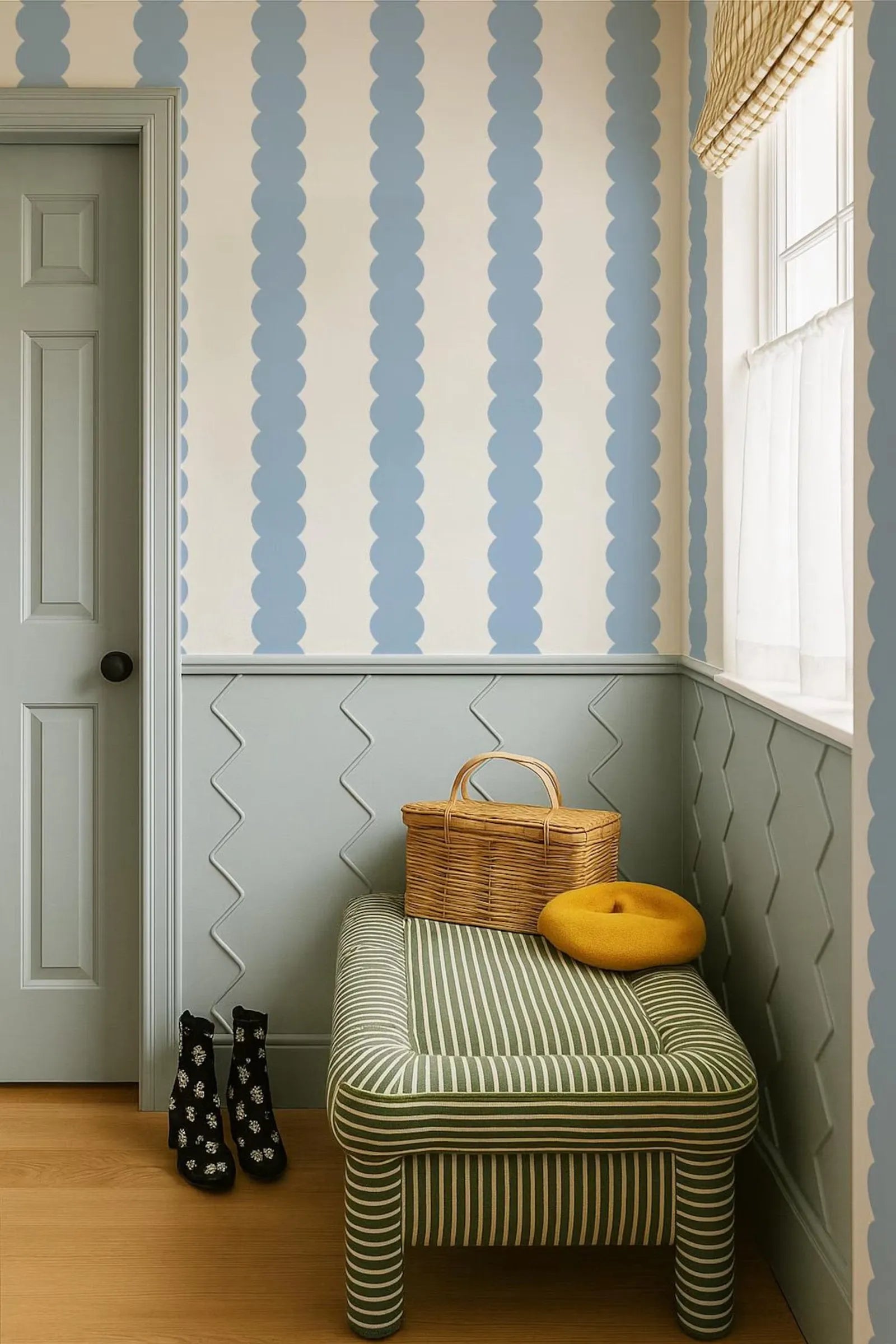 Add a modern and stylish touch to your interiors with our Blue Abstract Bubble Lines Wallpaper. Featuring scallop-inspired stripes with a bubble line effect in calming blue tones, this wallpaper creates a fresh, contemporary atmosphere. Available in both Peel & Stick for easy DIY or Tradition Unpasted for a classic finish.
