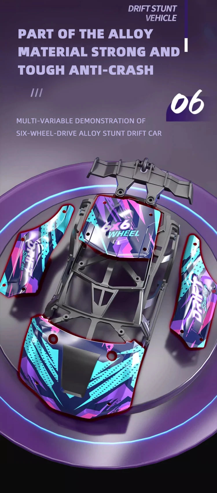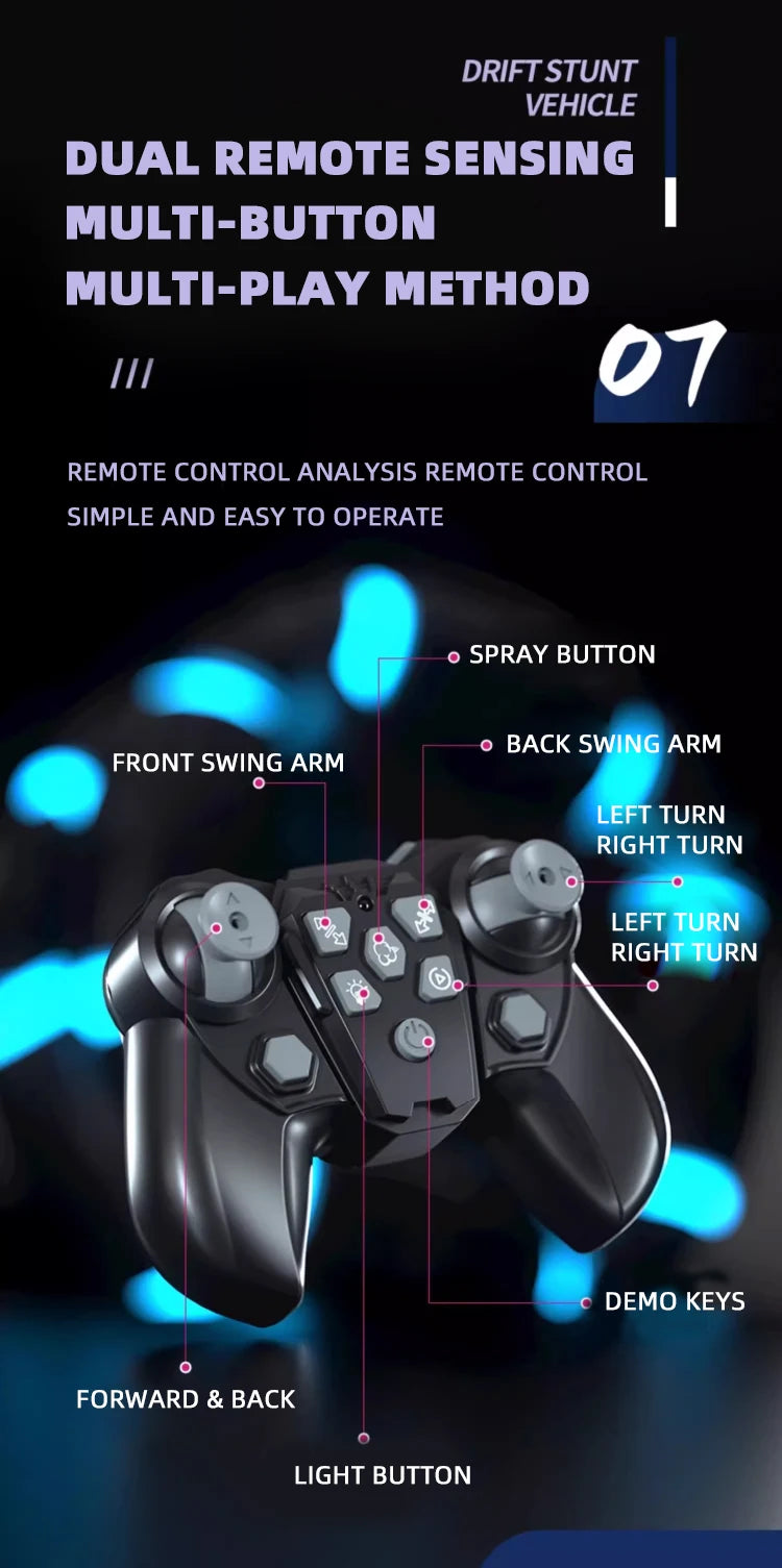 • Spec & play features: 6-channel Mode 2 transmitter, 4WD power, morphing 6-wheel chassis, drift + spray effects