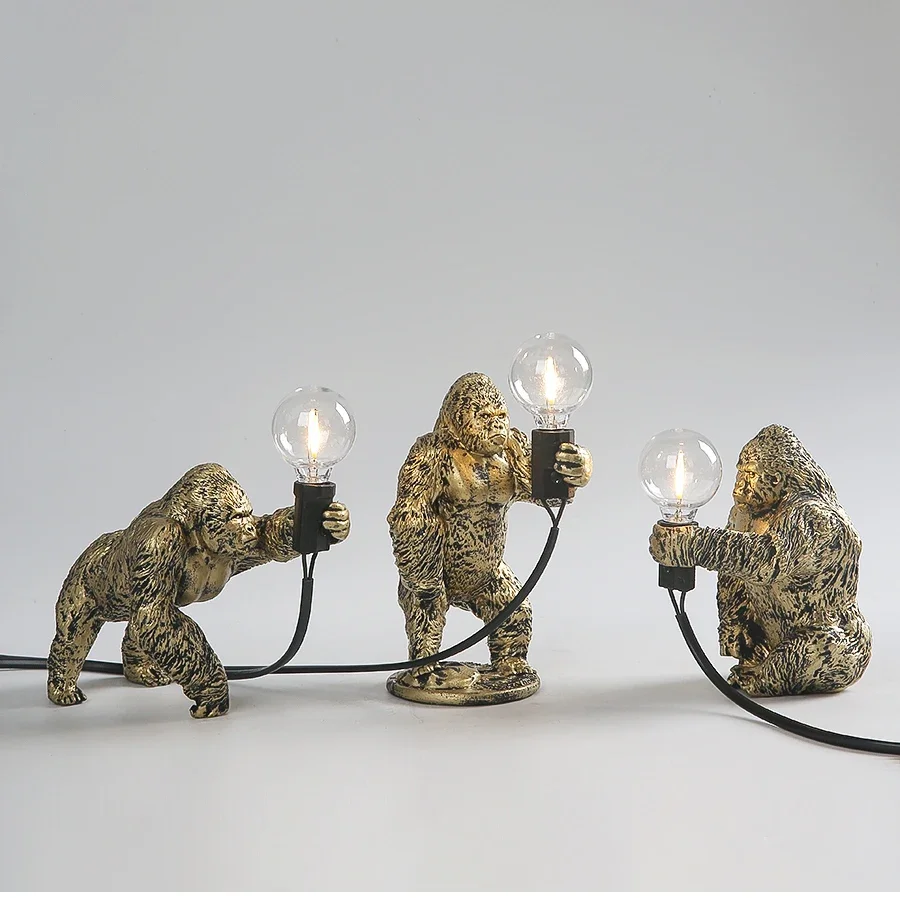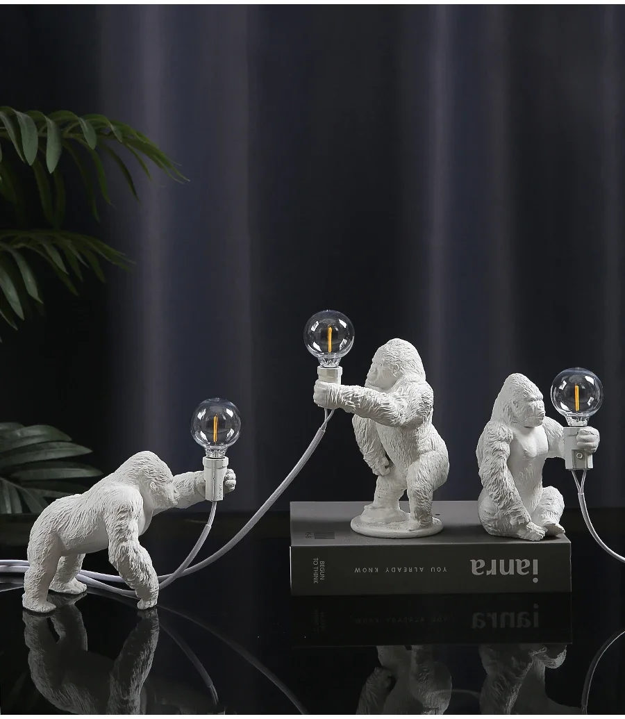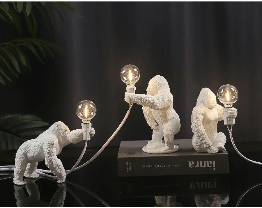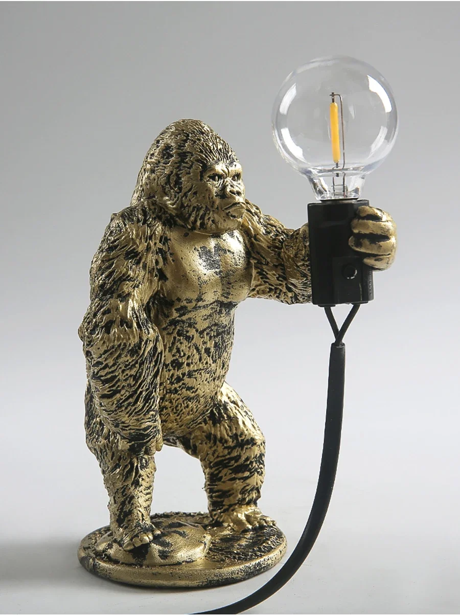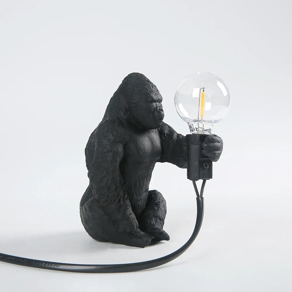 Bold and whimsical, this sculptural lamp features a mini gorilla figure in dynamic posture, holding a soft LED bulb—blending playful character with modern edge in one standout decorative piece.