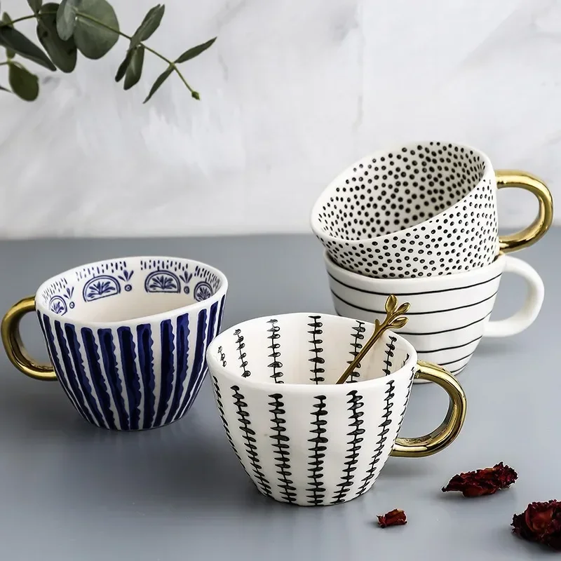 Designed to blend artistry with everyday ritual, this handcrafted ceramic cup features an irregular shape, bold geometric patterns, and a luminous gold handle—offering a luxurious and creative touch to your coffee, tea, or morning routine.