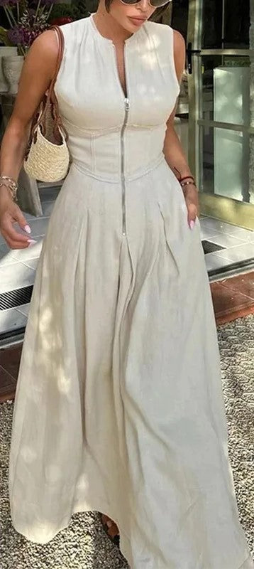 This elegant sleeveless bodycon dress pairs sleek tailoring with soft pleated details for a refined silhouette. Featuring a fitted bodice and flowing A-line hem, it’s designed for summer parties, evening occasions, or daytime chic.