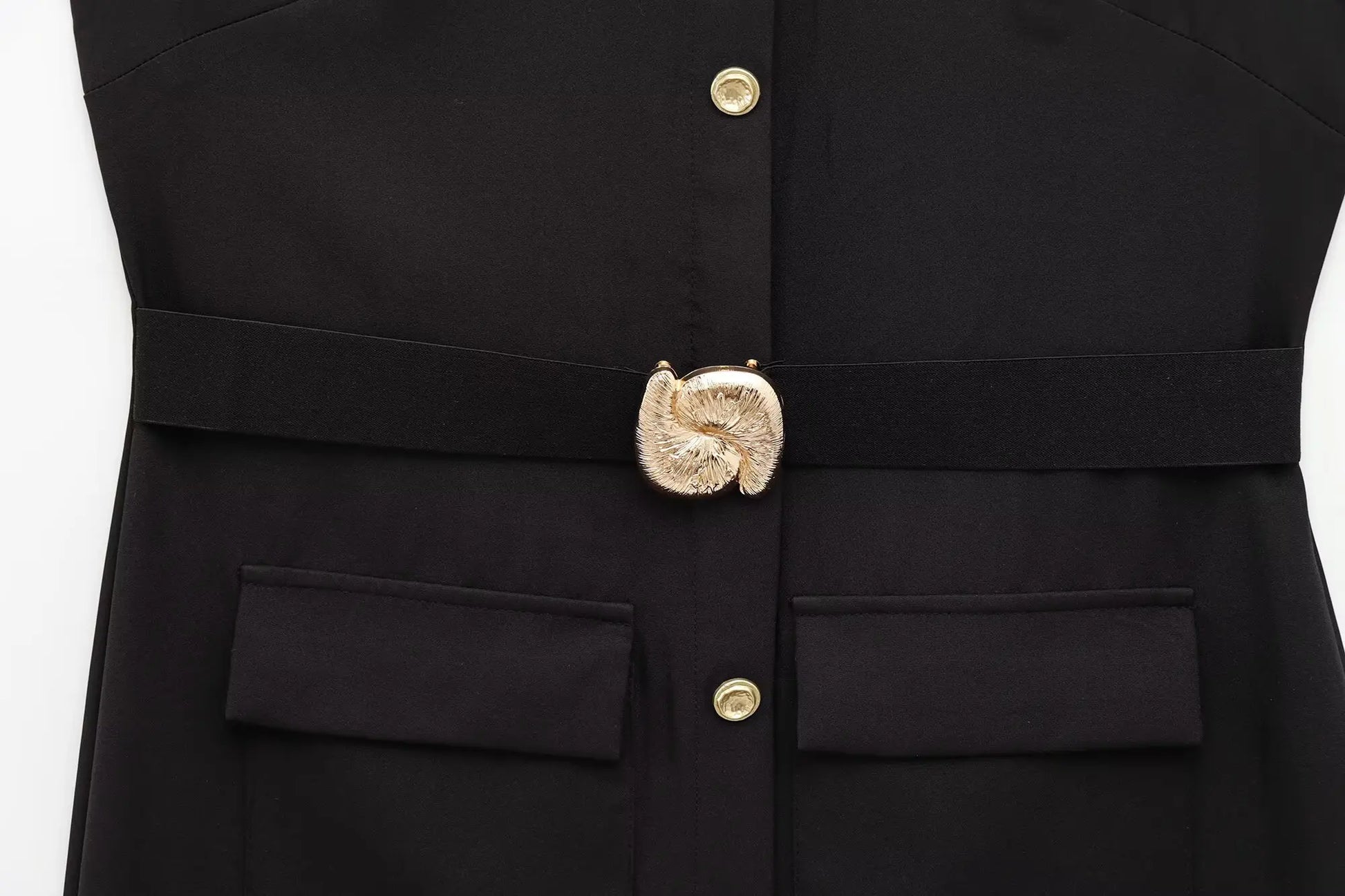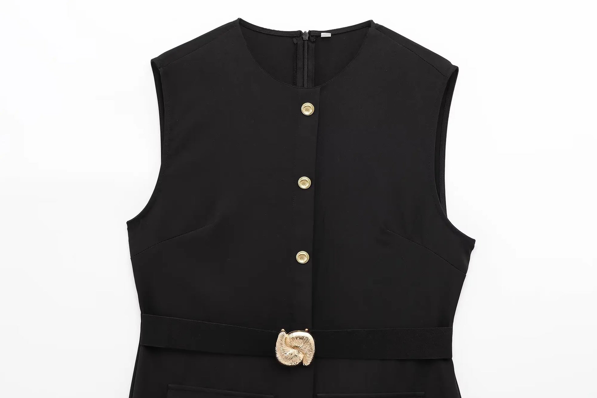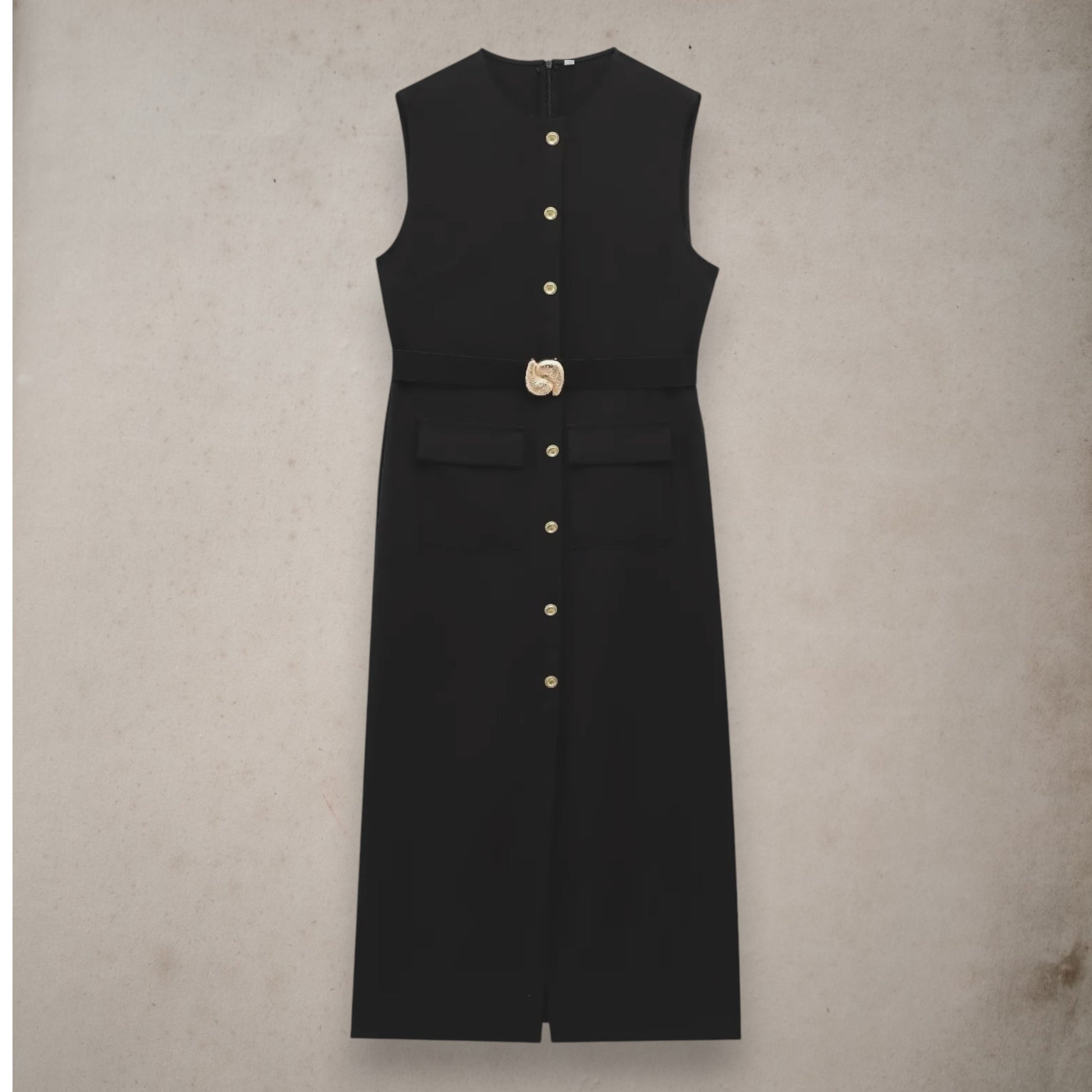 Timeless, structured, and effortlessly elegant, this black sleeveless dress features a flattering O-neck, single-breasted front, and a belt to define the waist. Ideal for both the office and after-hours occasions, it's a wardrobe essential with versatile appeal.