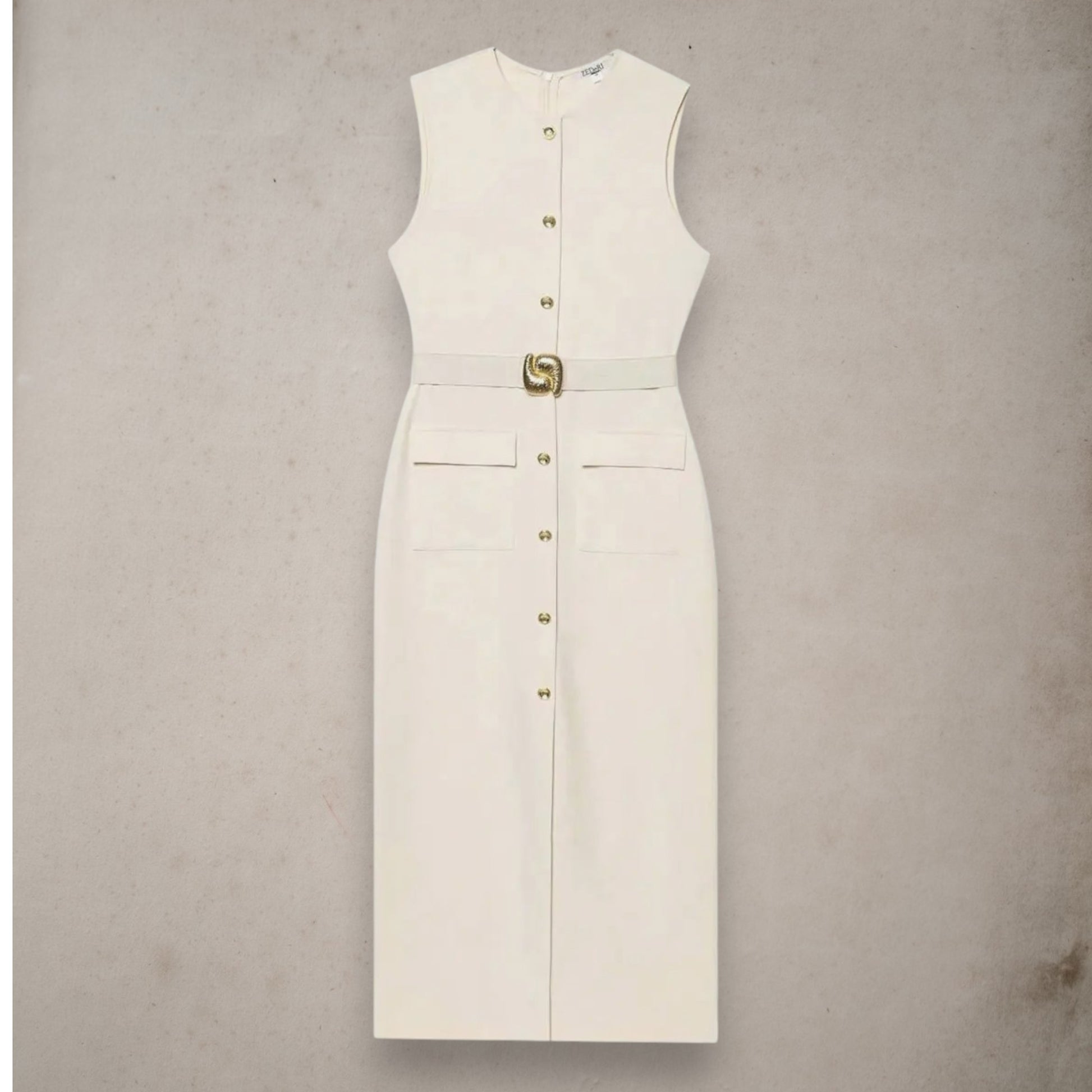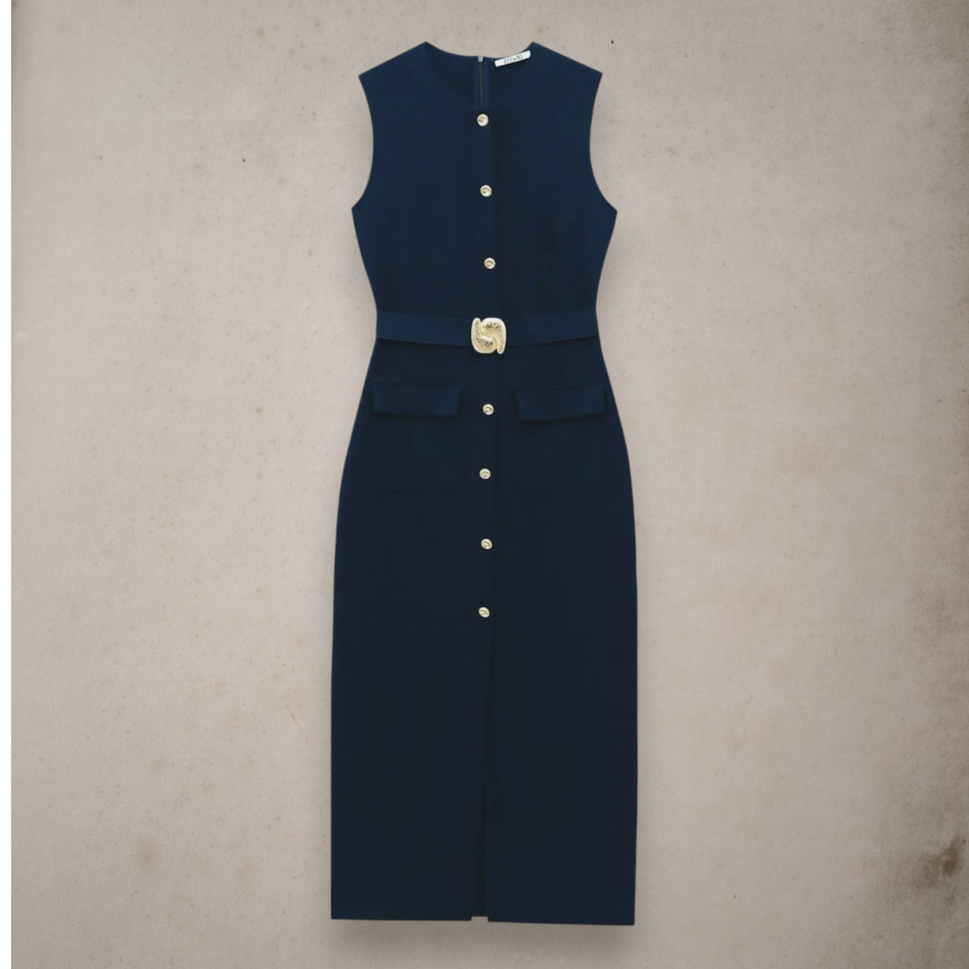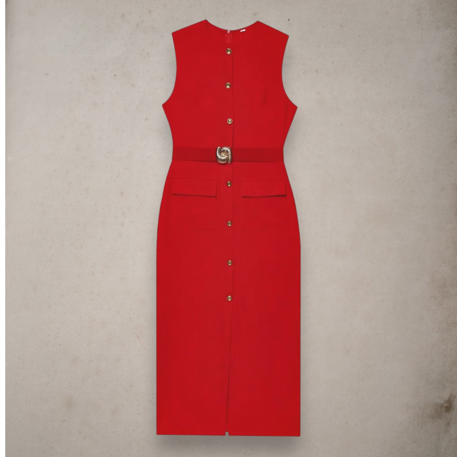 Timeless, structured, and effortlessly elegant, this black sleeveless dress features a flattering O-neck, single-breasted front, and a belt to define the waist. Ideal for both the office and after-hours occasions, it's a wardrobe essential with versatile appeal.