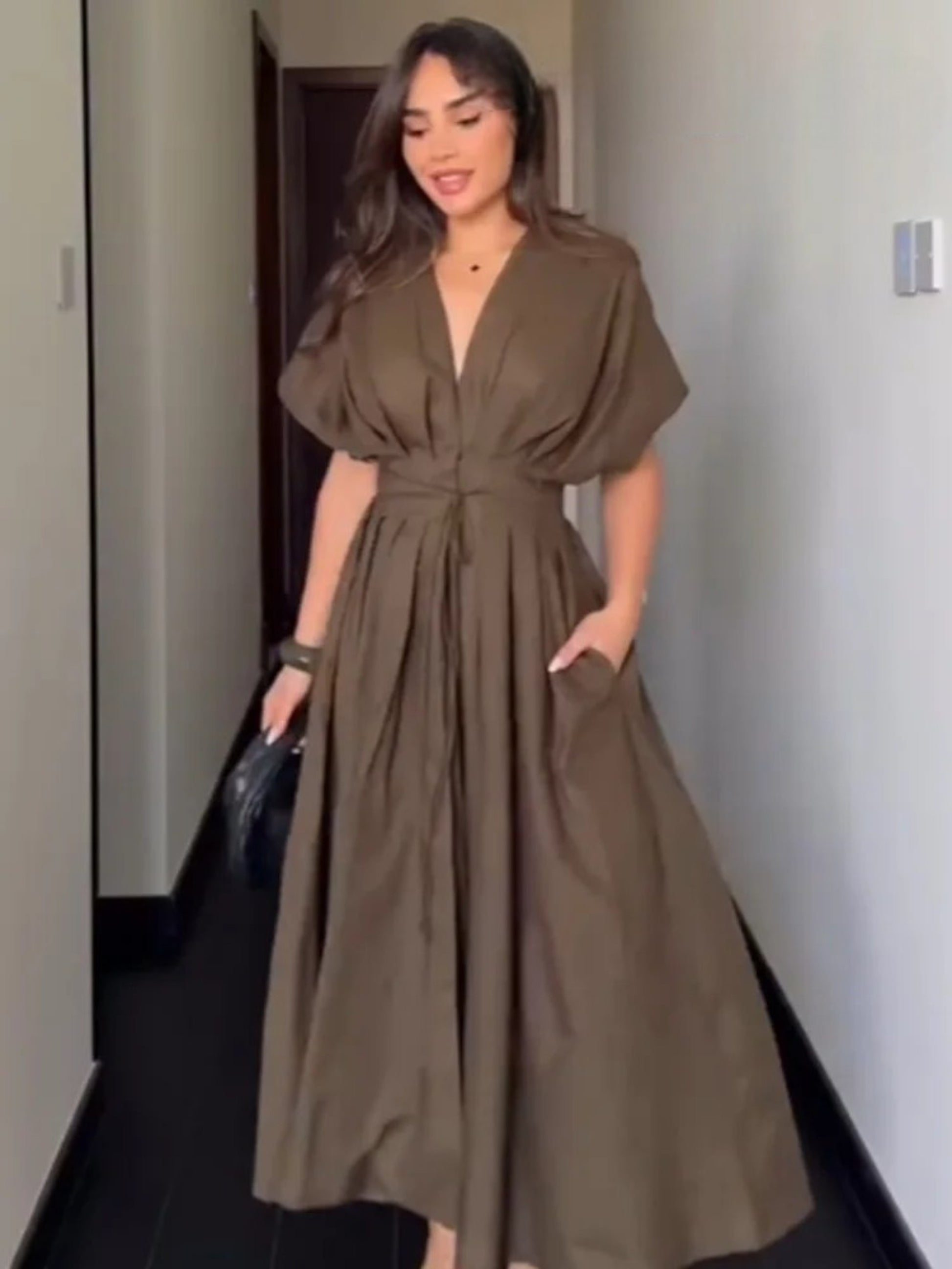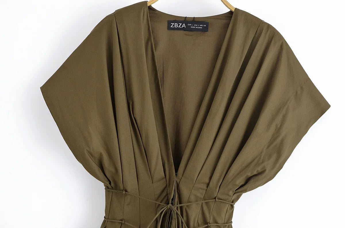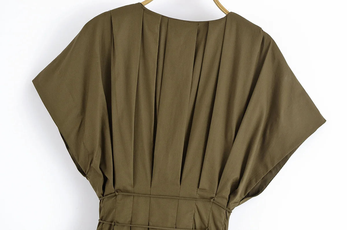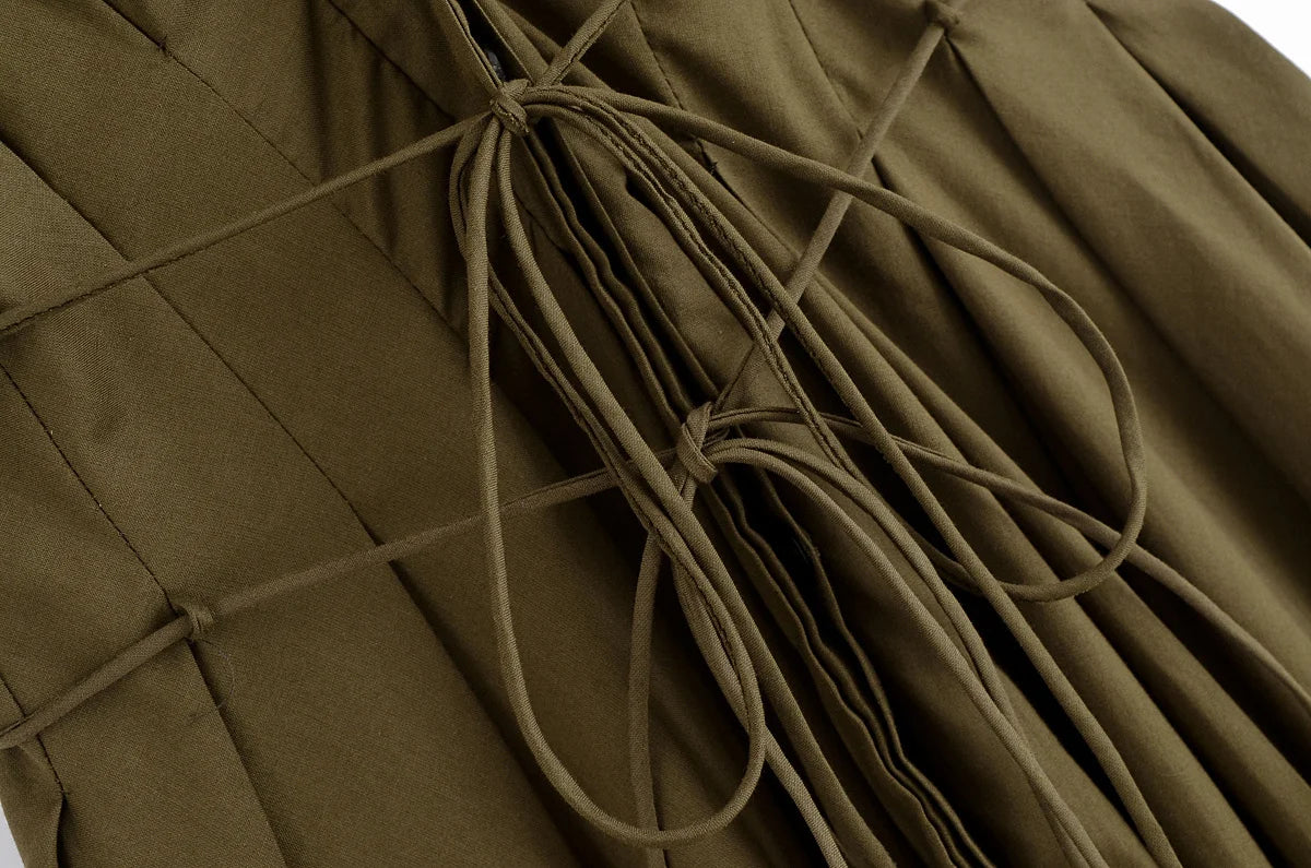 Strike the perfect balance between charm and sophistication with this V-neck lace-up midi dress, designed for sunny days and elegant evenings. Featuring a soft pleated silhouette and a flattering waistline, this piece redefines casual allure.