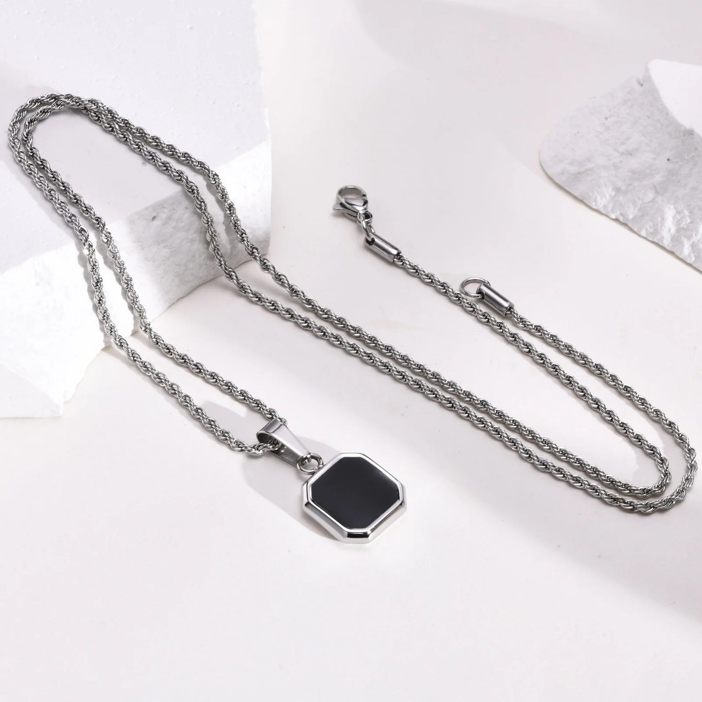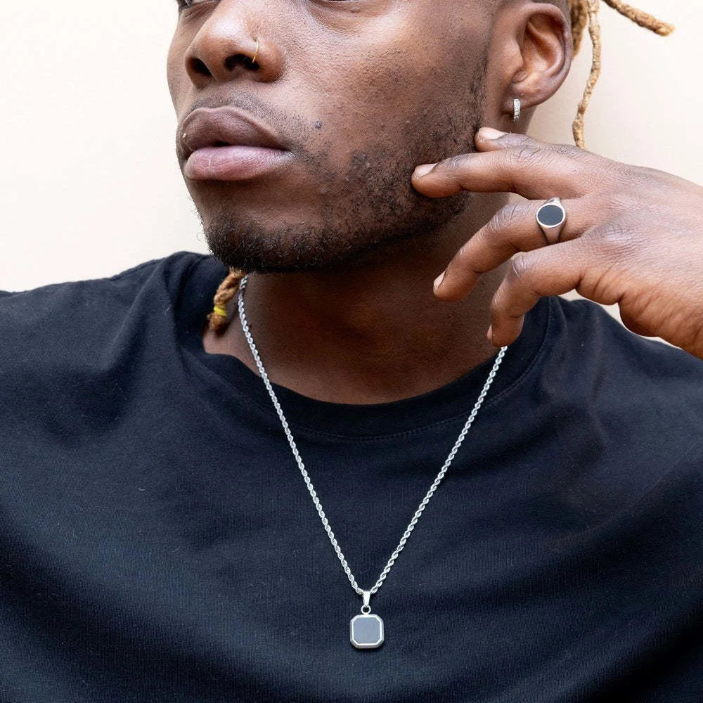 Grid Mark pairs a sharp 15×15 mm enamel square pendant with your choice of layered chains—rope, box/rolo, Cuban/curb, or Figaro—for a look that’s minimal, masculine, and ready for day, club, or anything in between.