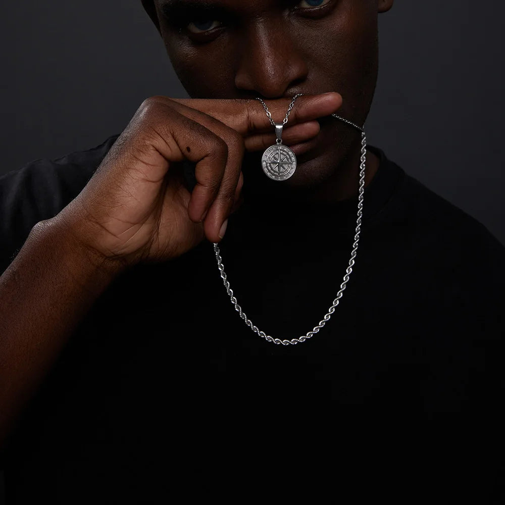 Compass Layer pairs a sleek compass pendant with layered stainless-steel chains—Cuban, Figaro, and Wheat—for a look that’s subtle, masculine, and ready for anywhere from daily grind to after-dark plans.